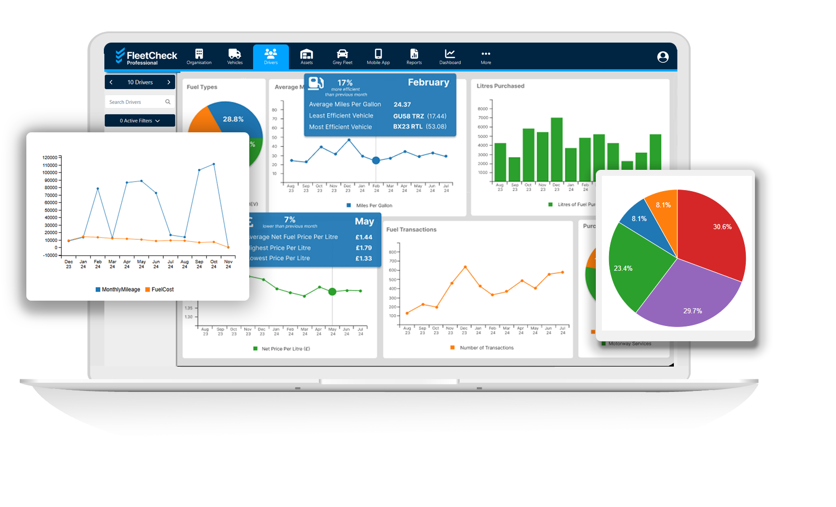 Centralise your fleet data and improve visibility and control. FleetCheck seamlessly integrates with over 250 third-party fleet suppliers, giving a complete 360° view of your drivers and vehicles - all in one place. Connect this information and uncover previously hidden insights that will improve your fleet’s reliability and compliance, as well as saving you valuable time!