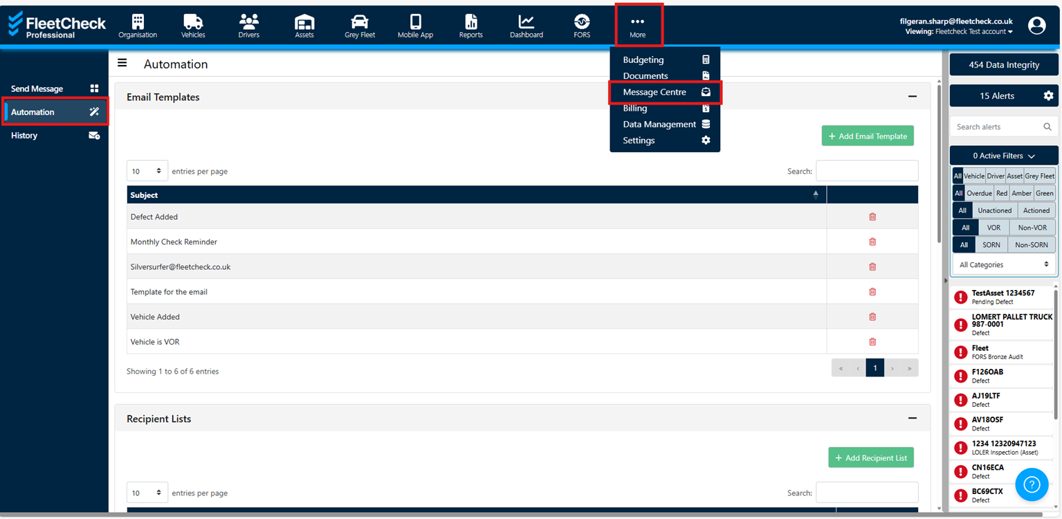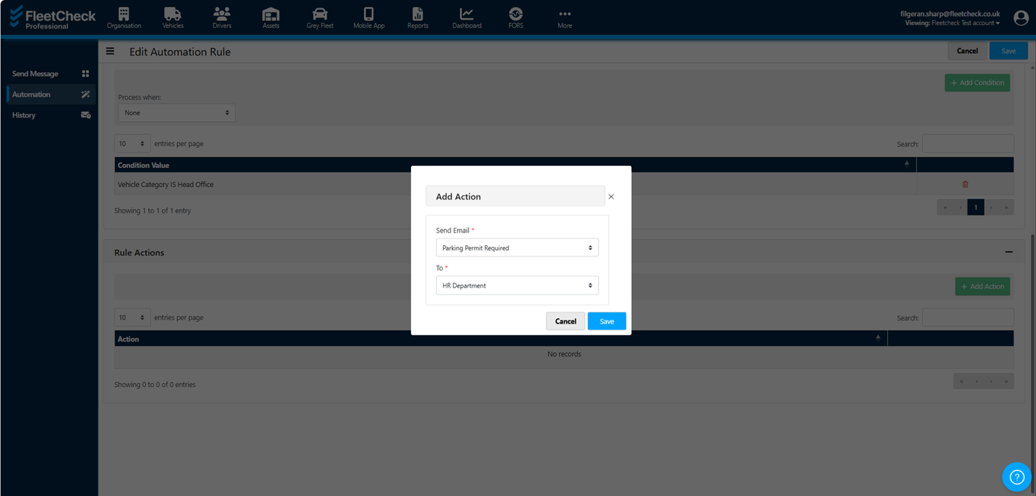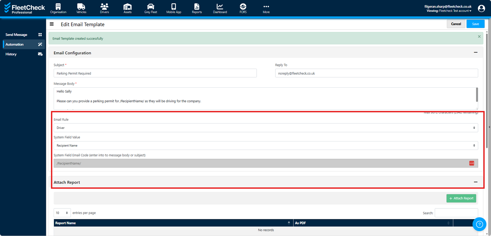 Click the ‘add email template’ button and give the email a subject and enter a message in the body. You are also able to set the template up to include names, vehicle reg etc using the ‘system field’ drop-down by entering the suggested text into your message. Reports and documents can also be added to the template.