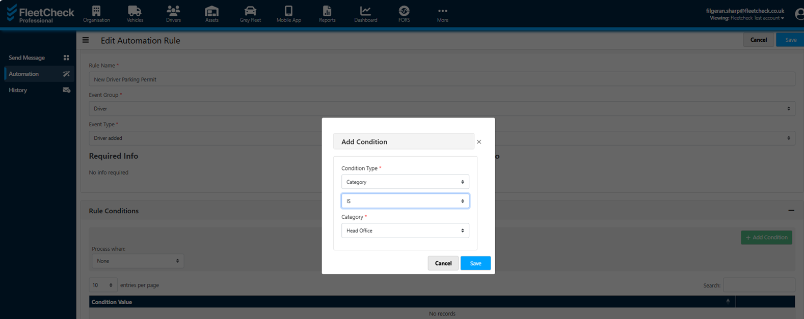 Once you are happy with the rule, click ‘next step’ where you will get to the ‘conditions’ page. You can add conditions for the ‘driver’ area based on the category, site or status. If you add conditions and actions, remember to click the ‘+’ button.