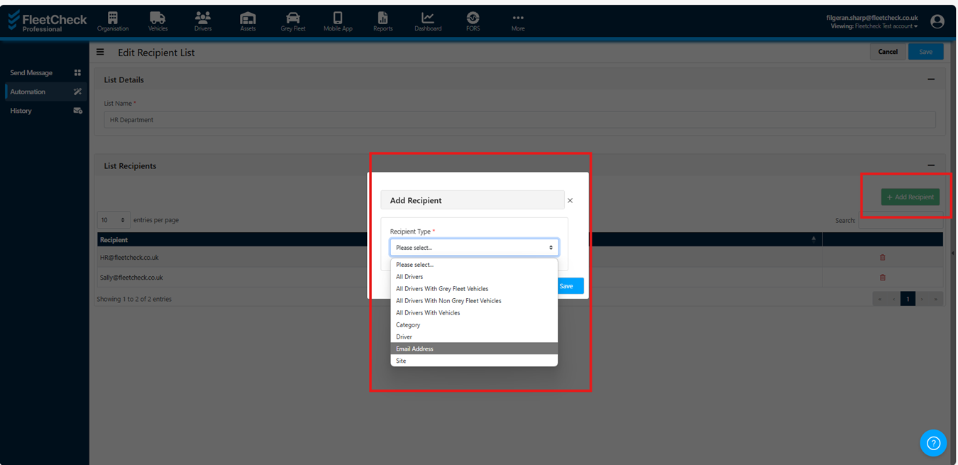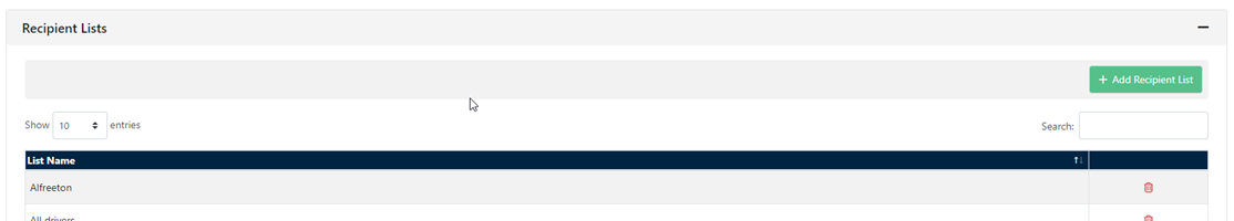 Give the recipient list a relevant name and choose who you want to add using all driver, specific categories, sites, or an email address. When adding recipients, make sure you click the Green ‘add’ buttons.