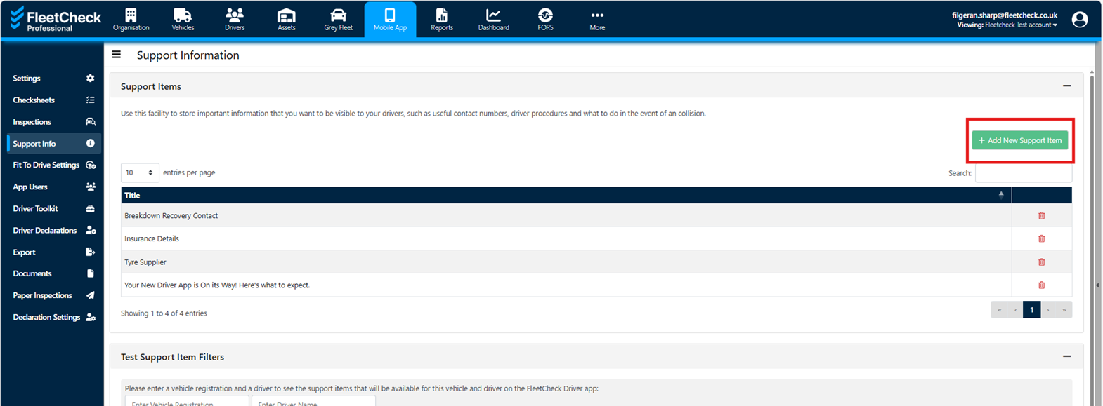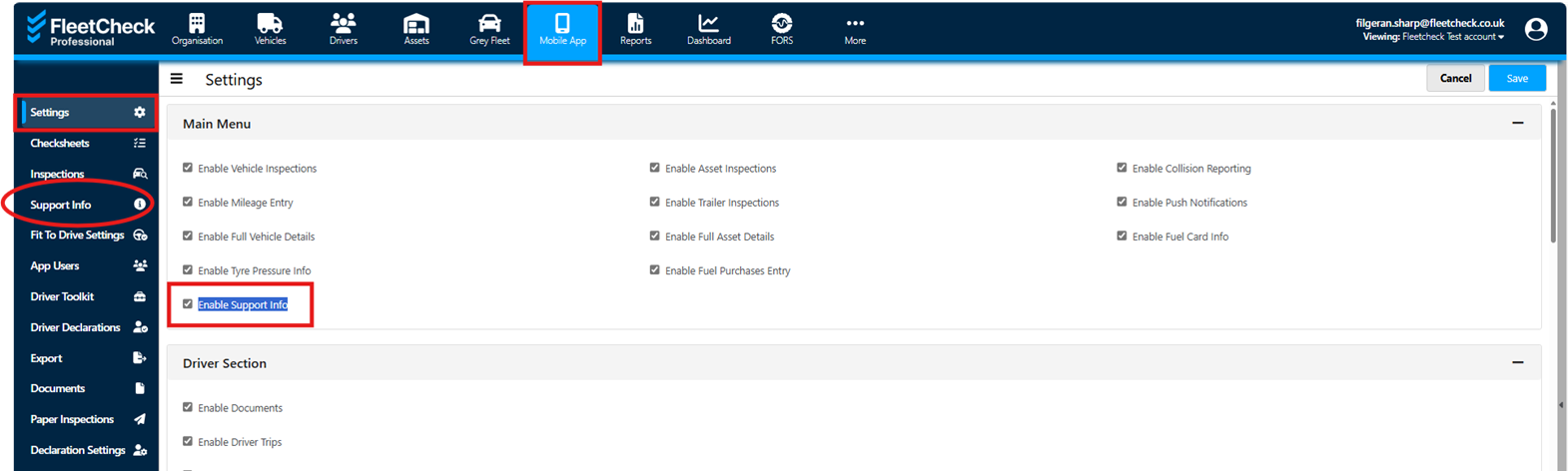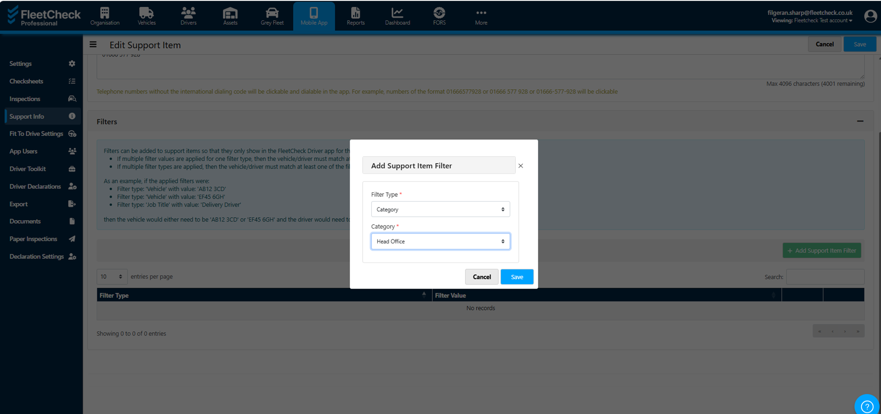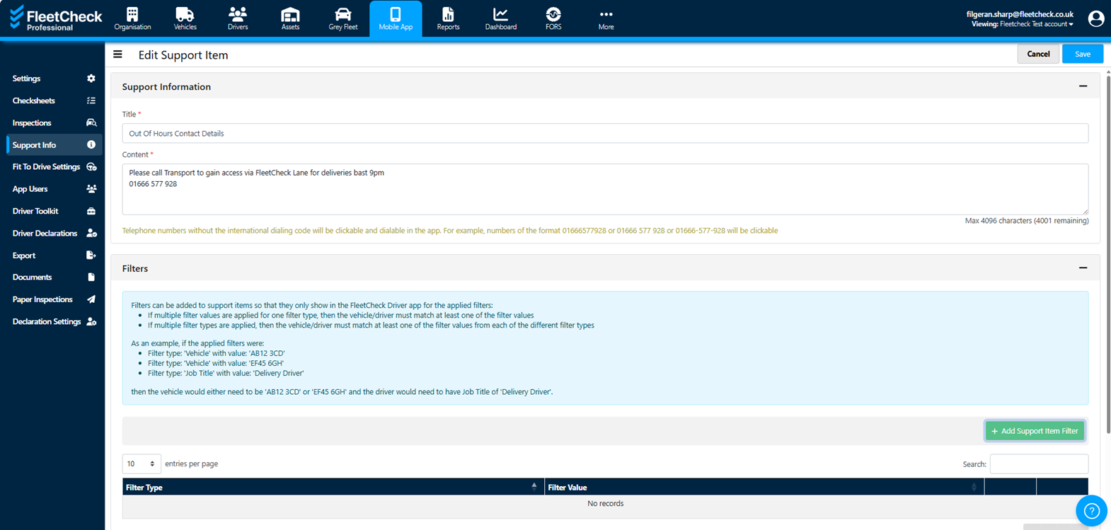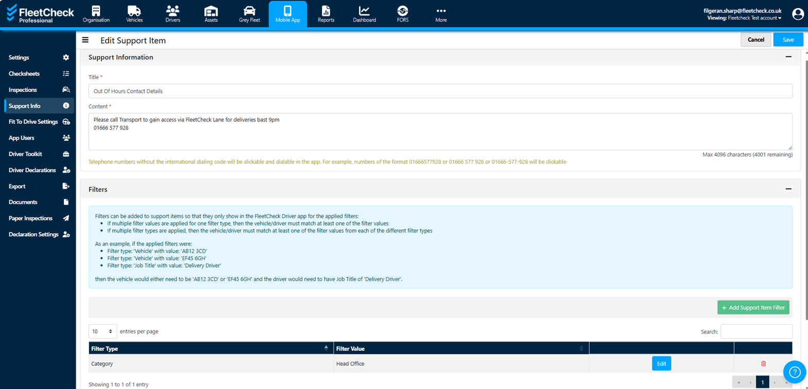 Once this is created, this will show under the Support Info tab of the app for drivers in this category.